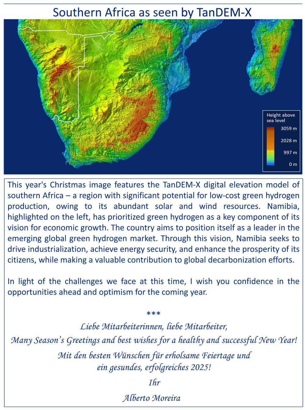 Das diesjährige Weihnachtsbild zeigt das digitale Höhenmodell TanDEM-X des südlichen Afrikas – eine Region, die aufgrund ihrer reichhaltigen Sonnen- und Windressourcen ein erhebliches Potenzial für die kostengünstige Produktion von grünem Wasserstoff bietet. Namibia, das links im Bild hervorgehoben wird, hat grünen Wasserstoff als Schlüsselkomponente seiner Vision für wirtschaftliches Wachstum priorisiert. Das Land strebt eine führende Position auf dem aufstrebenden globalen Markt für grünen Wasserstoff an. Mit dieser Vision will Namibia die Industrialisierung vorantreiben, Energiesicherheit erreichen und den Wohlstand seiner Bürgerinnen und Bürger steigern und gleichzeitig einen wertvollen Beitrag zu den weltweiten Maßnahmen zur Dekarbonisierung leisten.