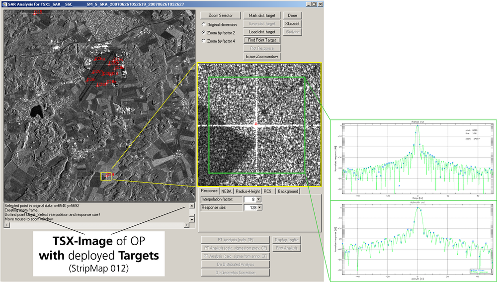 Ein Beispiel für diese Werkzeuge ist in der obigen Abbildung zu sehen, einem Screenshot von CALIX, der die Impulsantwortfunktion eines Punktziels in einem SAR-Bild zeigt, das in Entfernung und Azimut extrahiert wurde. Basierend auf dieser Punktzielanalyse können Messungen verschiedener Parameter der Impulsantwortfunktion abgeleitet werden, wie zum Beispiel die integrierte Punktzielenergie (zur Ableitung der absoluten Kalibrierfaktoren), das Verhältnis von Ziel zu Störsignal (zur Gewichtung der Kalibrierfaktorschätzungen) sowie Spitzenamplituden- und Phasenschätzungen im Falle von Mehrkanaldaten (zum Biespiel Quad-Pol). Darüber hinaus bietet CALIX Werkzeuge zur Analyse verteilter Ziele und zur geometrischen Kalibrierung (interne Verzögerung und Pixel-Lokalisierungsgenauigkeit, abgeleitet von genau vermessenen Zielen).