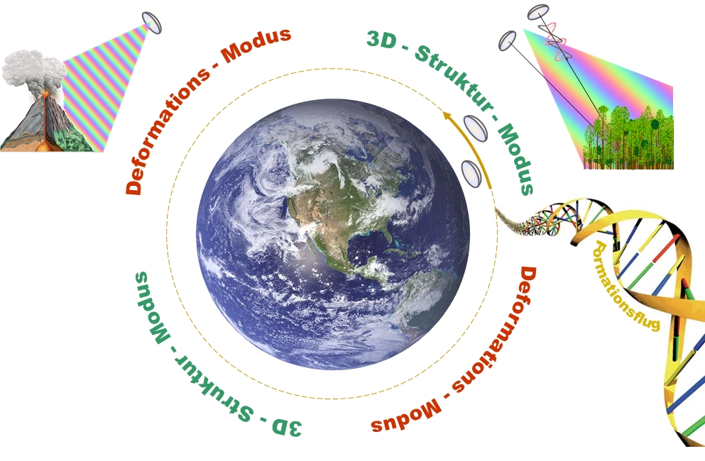 Die dreidimensionale Abbildung der Erdoberfläche und die tomographische Erfassung von 3D-Strukturen erfordert die simultane Bildaufnahme aus zwei unterschiedlichen Blickwinkeln. Der optimale Abstand zwischen den Aufnahmepositionen variiert dabei von ca. 1 km bis über 10 km. Eine variable Basislinie in dieser Größenordnung wird am besten von einem Paar in enger Formation fliegenden Radarsatelliten bereitgestellt. Eine Tandem-Formation ist nicht nur Grundvoraussetzung für die globale Messung von Waldhöhen und vertikalen Strukturprofilen, sondern sie bildet auch die Basis für eine Vielzahl weiterer innovativer Anwendungen, wie z.B.