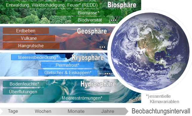 nicht nur das dynamische Gleichgewicht untereinander, sondern auch Physik und Chemie der Atmosphäre nachhaltig beeinflussen. Veränderungen in der Atmosphäre wirken sich wiederum auf Wetter und Klima aus und nehmen ihrerseits Einfluss auf eine Fülle von Prozessen in der Bio-, Geo-, Hydro- und Kryosphäre. Viele dieser komplexen Wechselwirkungen sind derzeit nicht oder nur äußerst unzureichend erforscht und verstanden. Ein wichtiger Grund hierfür ist, dass in der Regel Prozesse aus mehreren Erdsphären auf unterschiedlichsten räumlichen und zeitlichen Skalen miteinander verkoppelt sind, geeignete Beobachtungsdaten zur Analyse dieser vielfältigen Wechselwirkungen häufig jedoch entweder überhaupt nicht oder lokal und zeitlich nur sehr begrenzt zur Verfügung stehen.