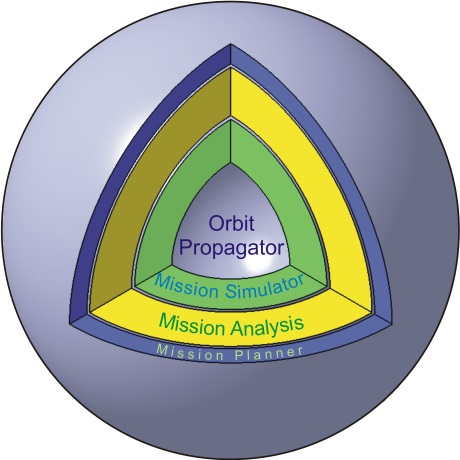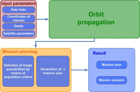 Das Missionsplanungswerkzeug findet Anwendung bei der Erstellung eines Szenarios, allgemeinen Analysen, Visualisierungen, Berichterstellung und Missionsplanung. Die selbstentwickelten Module für hochgenaue Abdeckungsanalysen, Missionsplanung und -optimierung, Missionsanalysen und Satellitensimulationen sind miteinander verbunden und integriert in dem Multi Satellite Mission Planner (MSMP). Der MSMP hat Schnittstellen für am Markt erhältliche Produkte, um eine Kompatibilität mit der Industrie zu gewährleisten. Der Missionssimulator erlaubt die Simulation jedes Missionsszenarios basierend auf Satelliten oder anderen Objekten (Drohnen, Jets, Schiffen, Landfahrzeugen) und deren Interaktion. Nutzer getriebene Szenarien für Bildaufnahmen oder mit Interaktionen zwischen den beschriebenen Objekten können simuliert und optimiert werden. Die Ergebnisse werden genutzt zum Zweck des Systemdesigns, als auch für Systemverifikationen während des realen Einsatzes des Satelliten im All. Alle Simulationen eignen sich für die Visualisierung in 3D, um Präsentationen oder Kurzfilme zu erstellen. Der Satellitensimulator erlaubt in der aktuellen Version die Simulation des Satellitensubsystems Orbitkontrolle und dem Subsystem Power. Ebenso liefert der Simulator für den Missionssimulator Informationen über Satellitenmanöver und Energiezustand. Bild 4 zeigt die modulare Architektur des Missionsplanungstools. Bild 5 stellt das schematische Konzept für die Simulation von Nutzerszenarios mit optimierenden Bildauftragszeitplänen für Aufträge mit unterschiedlichen Prioritäten dar.