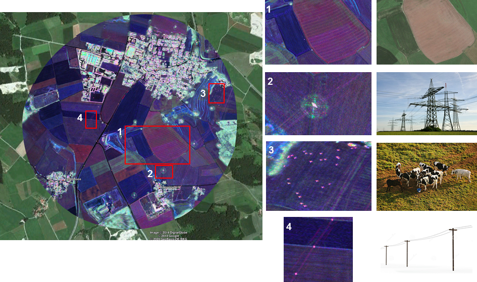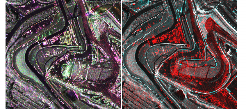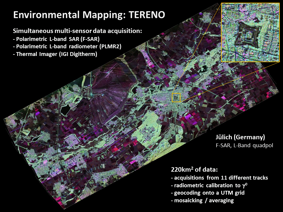 Polarimetrische F-SAR-Bilder können zu großflächigen Mosaiks kombiniert werden. Hierfür wird eine einfallswinkelabhängige, radiometrische Korrektur vorgenommen. Systembedingte Randeffekte an den Streifengrenzen werden dank der radiometrischen 3D-Korrektur der Antennendiagramme vermieden.