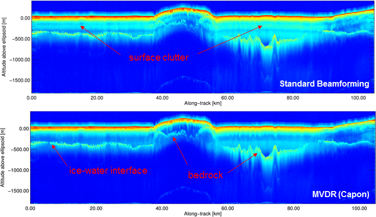 Das SAR-Verfahren kann auch für nadir-gerichtete Radarsysteme zur Eisdickenmessung eingesetzt werden. Der zusätzliche Kompressionsgewinn erlaubt eine verbesserte Detektion des Felsuntergrundes. Mehrdeutige Signale von der Eisoberfläche müssen hingegen mit Mehrkanaldaten und Ausnutzung von Strahlformungstechniken unterdrückt werden.