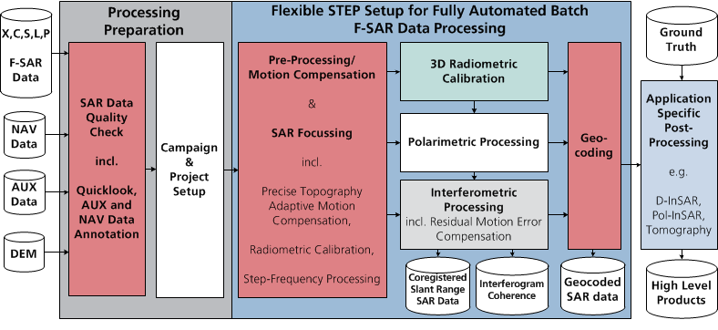 STEP ist die Offline-Prozessierungssoftware für F-SAR-Datenprodukte mit höchstmöglicher Auflösung und optimaler Kalibriergenauigkeit. Der Prozessor beinhaltet: