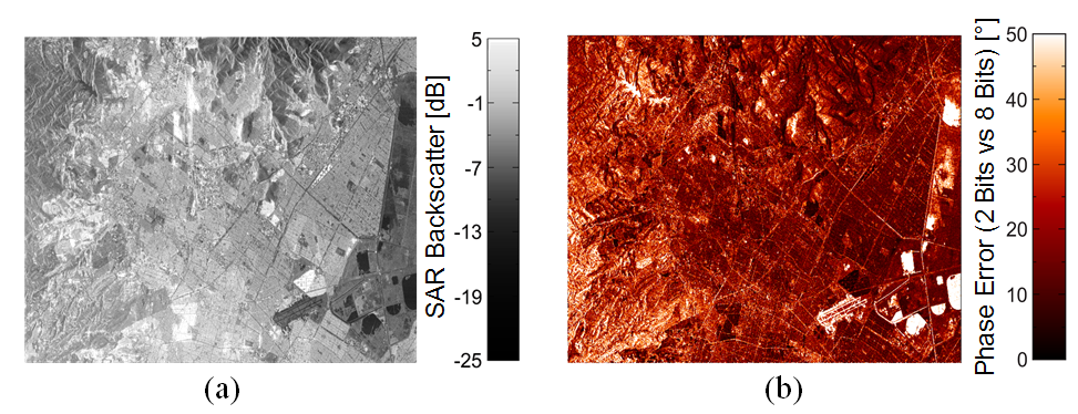 Darüber hinaus konzentrieren wir uns auf die Definition und Implementierung neuer Algorithmen zur Unterstützung laufender und zukünftiger SAR-Missionen, wie zum Beispiel die Entwicklung innovativer Methoden zur Datenreduktion an Bord. In der Tat wird für die gegenwärtigen und zukünftigen weltraumgestützten SAR-Missionen ein immer größeres Volumen an On-Board-Daten benötigt, was vom Missionsdesign her höhere Anforderungen an den On-Board-Speicher und die Downlink-Kapazität mit sich bringt. In diesem Szenario ist die Quantisierung der SAR-Rohdaten ein wichtiger Aspekt, da die für die Digitalisierung der Rohdaten verwendete Datenrate die Menge der zu speichernden und zum Boden zu übertragenden Daten bestimmt, sich aber auch direkt auf die Leistung der SAR-Produkte auswirkt. Abbildung 2 zeigt auf der linken Seite die Radarrückstreukarte des Stadtgebiets von Mexiko-Stadt, die von TanDEM-X erfasst wurde, und auf der rechten Seite die Phasenfehlerkarte desselben Gebiets aufgrund der Quantisierung der Rohdaten. Der Phasenfehler wurde durch den Vergleich des Interferogramms, das durch die Digitalisierung der gleichen Rohdaten mit einem adaptiven Blockquantisierer (BAQ) bei 2 Bits/Sample erzeugt wurde, mit dem nicht komprimierten Interferogramm ermittelt. Höhere Phasenfehler befinden sich in Bereichen mit geringerer Rückstreuung und umgekehrt. Die Forschungsaktivitäten der Gruppe zielen darauf ab, neuartige Methoden zur effizienten Datenreduzierung im Rahmen zukünftiger Missionen, wie Mehrkanal-SAR oder gestaffelte SAR-Systeme, zu untersuchen.