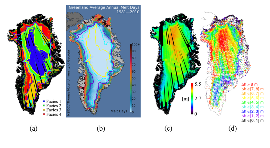 In diesem Rahmen konzentrieren wir uns derzeit auf die Entwicklung neuer Algorithmen für den Abruf geophysikalischer Größen aus SAR-Bildern, wobei wir uns insbesondere auf die Analyse multitemporaler Daten, auf maschinelles Lernen und auf Deep Learning basierende Klassifizierungsansätze sowie auf die Fusion von Multisensordaten konzentrieren. Ein Beispiel für den Bereich der Biosphäre ist die TanDEM-X Forest/Non-Forest Map , eine neue globale binäre Schicht mit einer Auflösung von 50 x 50 Metern, die in Abbildung 6 dargestellt ist. Dieses Produkt ist ein äußerst wertvoller Ausgangspunkt für die Überwachung der Entwaldung in großem Maßstab oder für die Untersuchung von multitemporalen Sentinel-1-Stapeln für die Überwachung von Wäldern durch die Kombination von interferometrischer Modellierung und Klassifizierungsalgorithmen mit maschinellem Lernen. Weitere Beispiele aus dem Bereich der Kryosphäre sind die Klassifizierung der Schneefazies des grönländischen Eisschilds mit Hilfe von interferometrischen TanDEM-X-Daten und die Schätzung der X-Band-Eindringtiefe, wie in Abbildung 7 dargestellt.