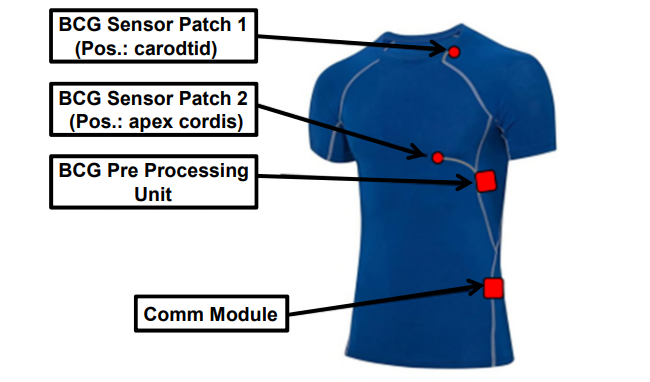 - 1 Comm-Module sowie SmartShirt mit integrierten Sensoren: Das Smartshirt wird für die BCG-Messung eingesetzt und es ist mit dem Comm-Modul verbunden, das die Daten zum Netzwerk weiterleitet.