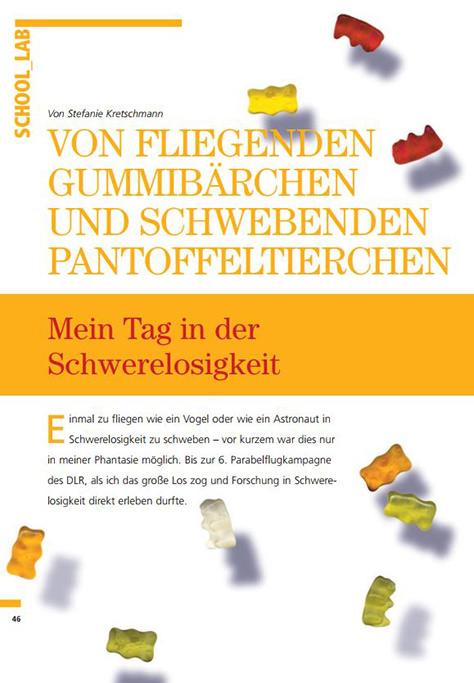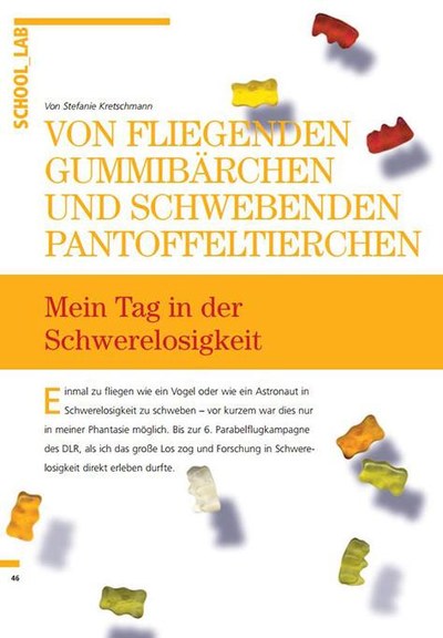Im Rahmen eines wissenschaftlichen Experiments ist gelegentlich sogar ein Mitflug von Schülern möglich – wenn das Mindestalter von 18 Jahren erreicht ist. Hin und wieder gibt es spezielle Projekte von verschiedenen Universitäten, bei denen Parabelflug-Experimente in enger Kooperation mit Schulen bearbeitet und gemeinsam durchgeführt wurden. Gut eingearbeitete und engagierte Schüler durften auch hierbei mit an Bord.