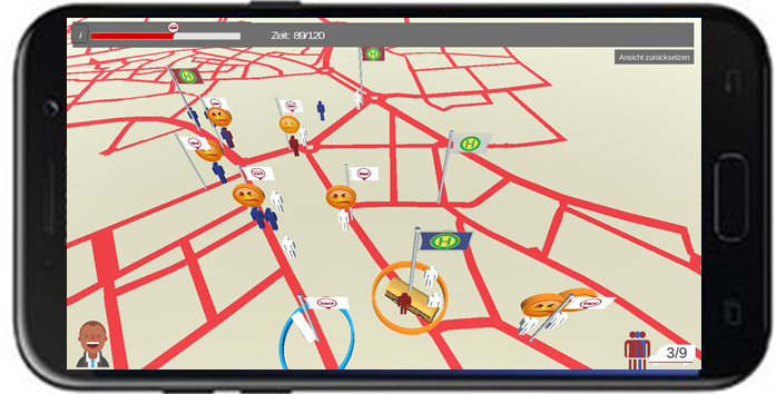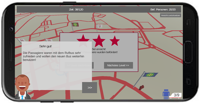Eine Herausforderung dabei ist auch, ein neues Mobilitätskonzept immersiv, also anschaulich und verständlich, zu vermitteln. Hierzu haben wir ein eigenes Serious Game entwickelt, ein digitales Lernspiel, mit dessen Hilfe das Konzept eines Mobility-on-Demand-Shuttles spielerisch vermittelt wird. Das Serious Game „B.u.S.“ haben wir dann in einer Evaluationsstudie in einer Schule eingesetzt.