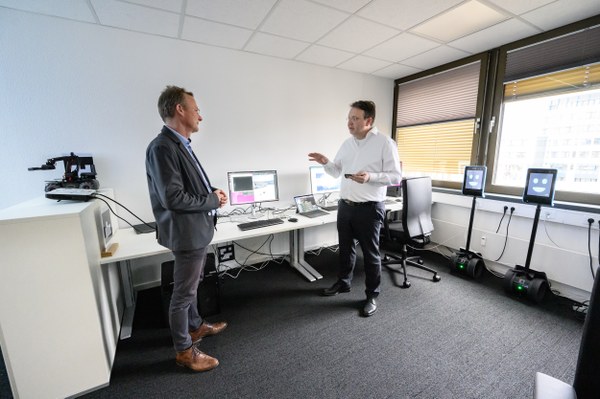 Prof. Dr. Frank Köster präsentierte MdB Maik Außendorf in Sankt Augustin die aktuellen Fortschritte unseres Living-Lab-Projekts, das sich auf Trainings- und Implementierungsverfahren für selbstfahrende Serviceroboter konzentriert. Dabei liegt der Fokus auf direkter Rückkopplung des Verhaltens und der Anpassung der KI-Algorithmen während des Trainings.