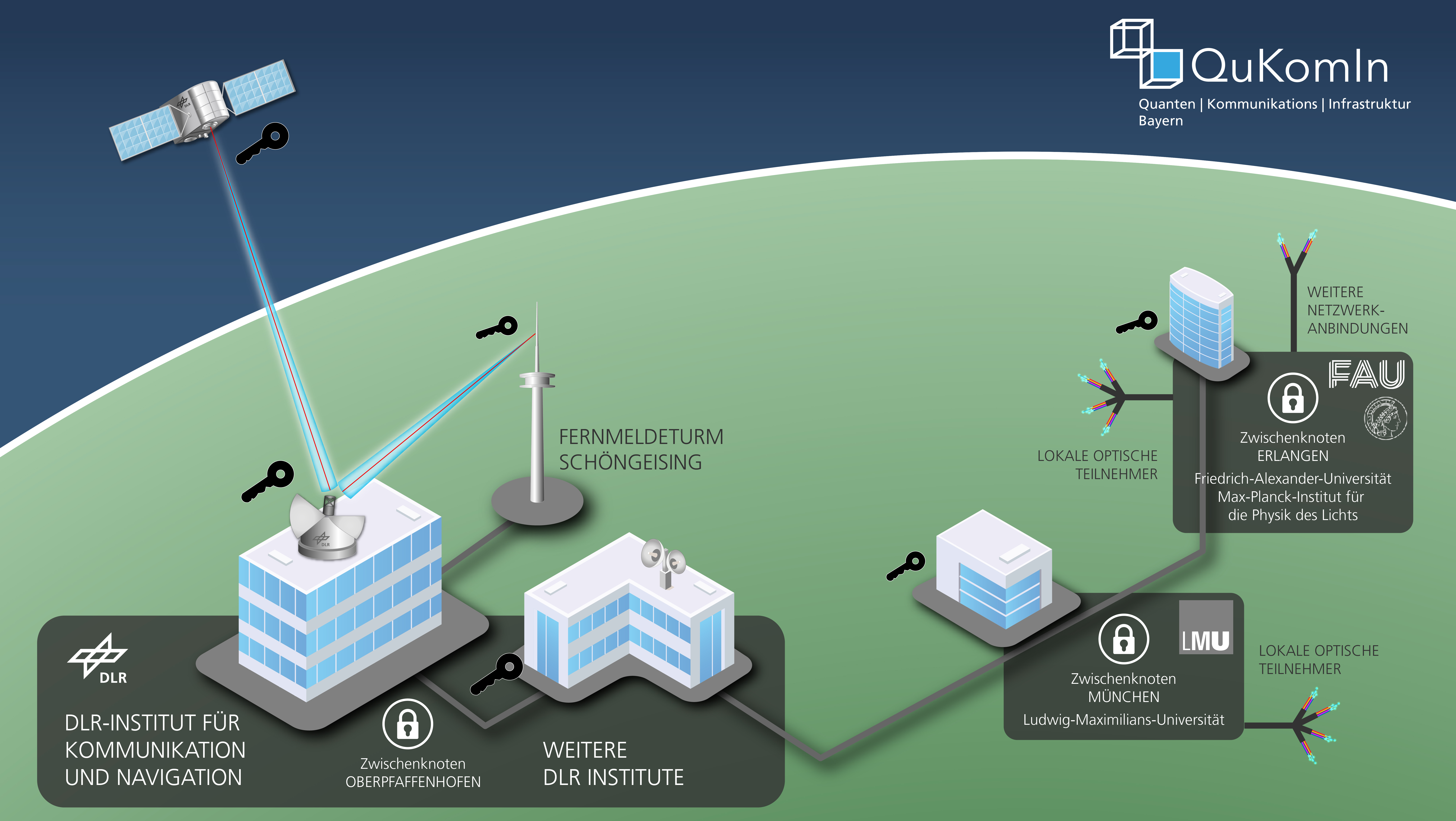 Die Infrastruktur von QuKomIn entsteht als hybrides Glasfasernetz mit Freistrahl- und Satellitenanbindung sowie Applikationslaboren in der Region Erlangen und München/Oberpfaffenhofen. Im Applikationslabor des DLR in Oberpfaffenhofen liegt der Schwerpunkt auf der Erforschung, Erprobung und Demonstration von Systemen der Satelliten-basierten Quantenkommunikation.