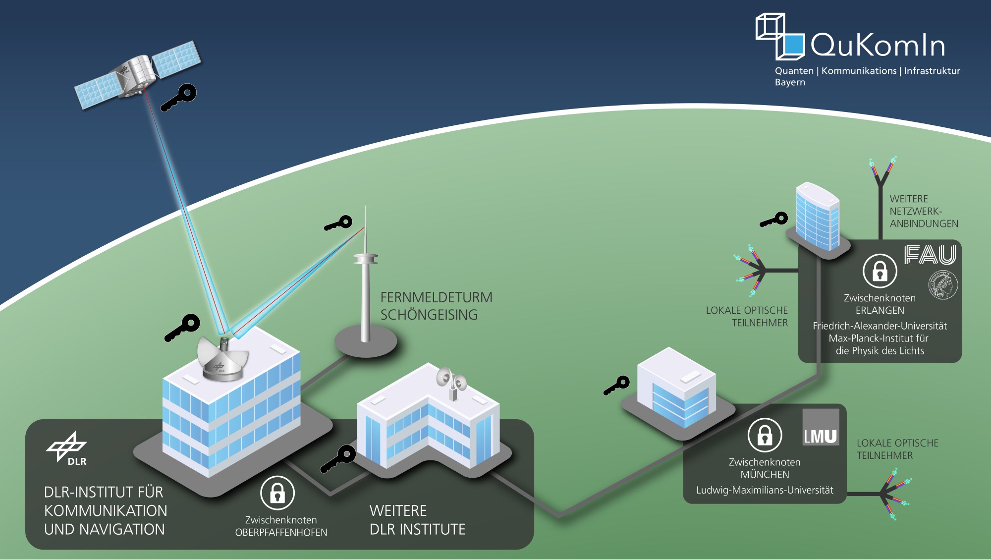 Quantenschlüsselverteilung über hybride Teststrecken: Des Ziel des Projektes QuKomIn ist der Aufbau eines hybriden Netzwerkes bestehend aus Satellitenanbindung, Glasfasernetzen und Applikationslaboren für die Quantenkommunikation.