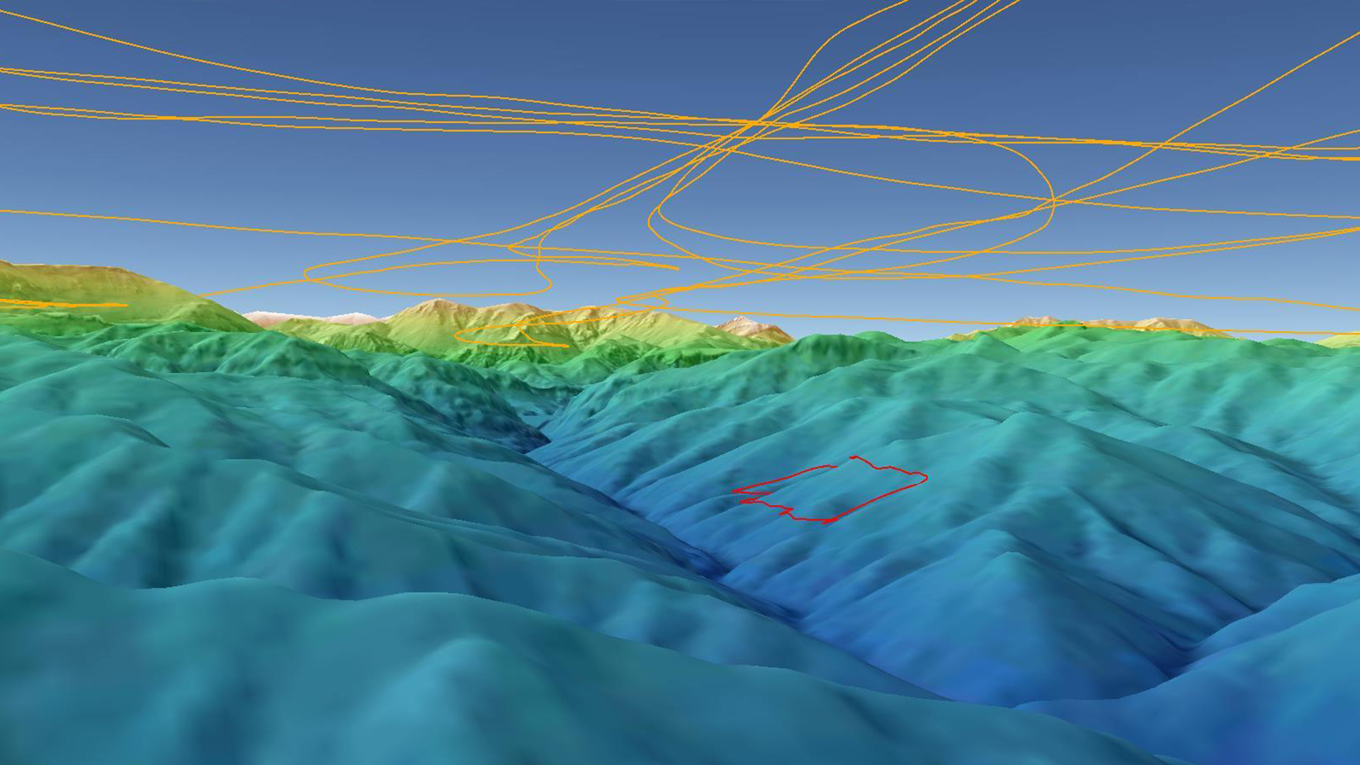 Die gelben Linien zeigen den Flugpfad des Hubschraubers während des Brandes an. Das Zielgebiet wurde aus verschiedenen Richtungen mehrfach überflogen, um optimale Ergebnisse zu erhalten.