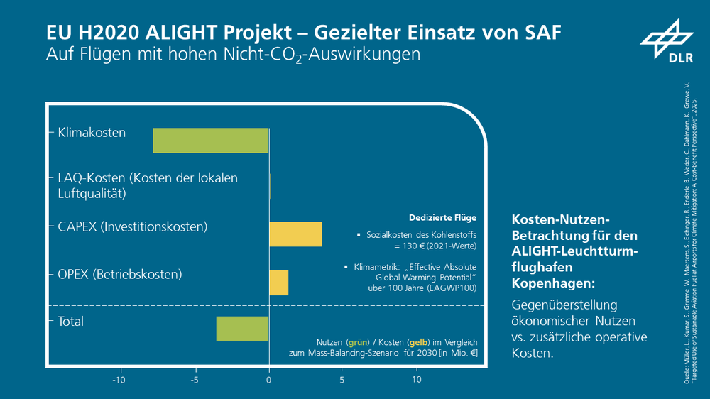 1Müller, L., Kumar, S., Grimme, W., Maertens, S., Eichinger, R., Enderle, B., Weder, C., Dahlmann, K., Grewe, V., “Targeted Use of Sustainable Aviation Fuel at Airports for Climate Mitigation: A Cost-Benefit Perspective”, 2025.