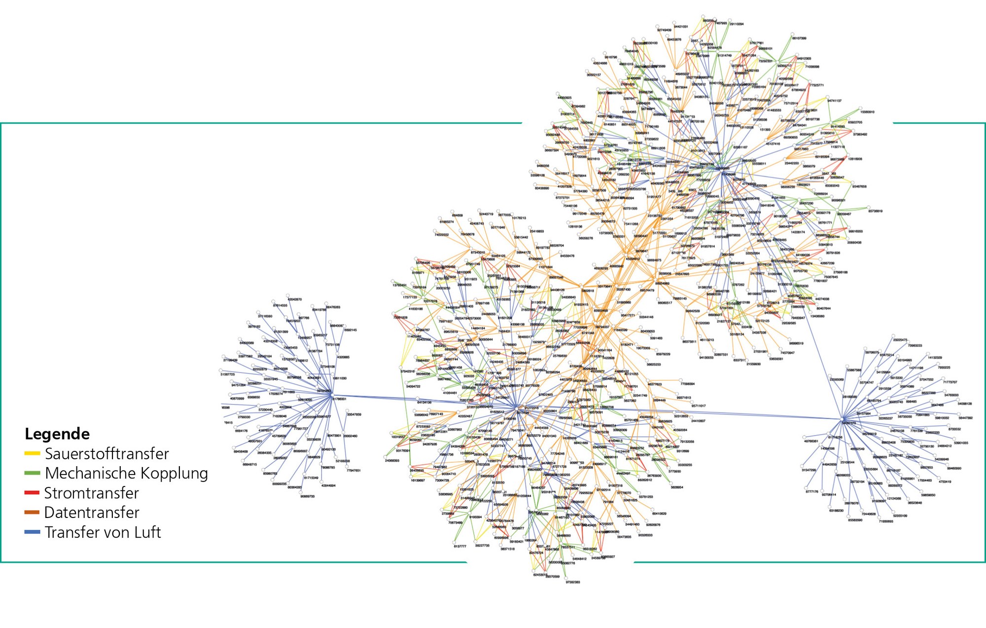 Die Nummern des Netzes bezeichnen jeweils eine Kabinenkomponente, die wiederum über eine Linie mit einer anderen Komponente verbunden ist. Die Farben bezeichnen die verschiedenen Kopplungsarten: Ist es eine rein mechanische Kopplung oder wird zwischen den Komponenten ein Medium übertragen (Luft, Strom, Daten, Sauerstoff)?