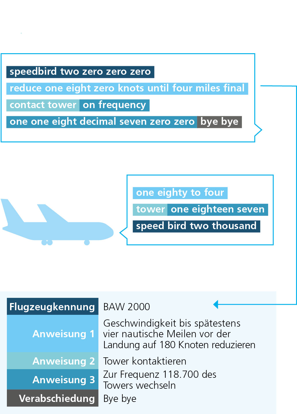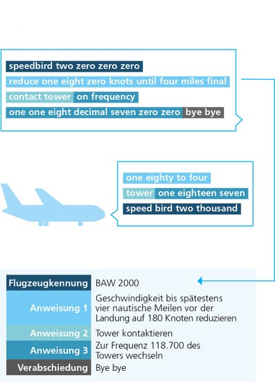 Oben sieht man eine typische Lotsenäußerung aus der Anflugkontrolle. Sie beginnt mit dem Rufzeichen, also dem Namen des Fluges. Es folgt die Anweisung, die Geschwindigkeit auf 180 Knoten zu reduzieren, was spätestens vier nautische Meilen vor der Landung erreicht sein sollte. Anschließend soll der Pilot oder die Pilotin zur Frequenz 118.700 des Towers wechseln. Der Pilot oder die Pilotin wiederholt die Geschwindigkeit sowie die Tower-Frequenz und zum Schluss das Rufzeichen.