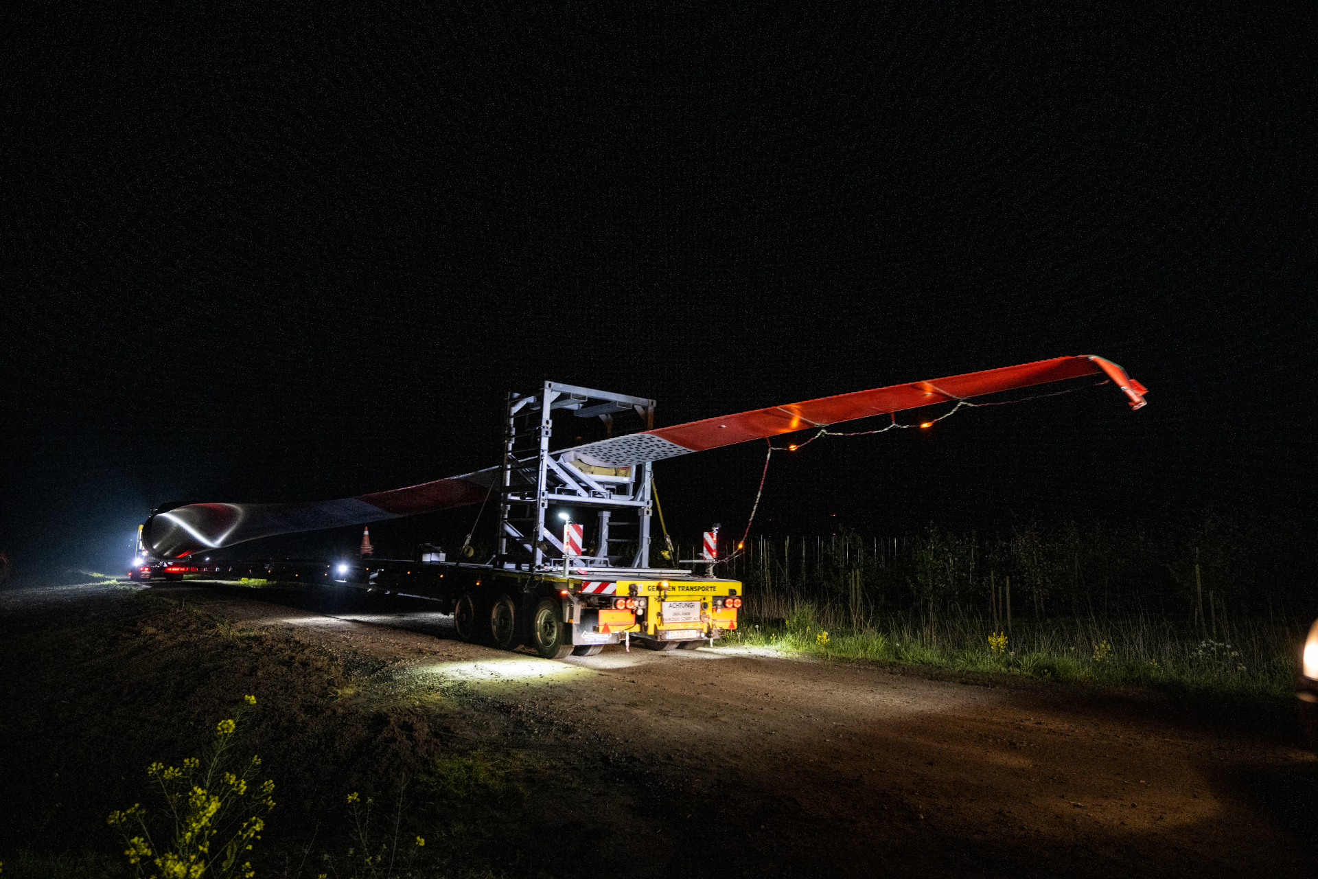 Mitte März wurden der Generator, das über 70 Tonnen schwere Maschinenhaus und die Rotorblätter für die Windenergieanlage OPUS 1 angeliefert. Der Transport der drei über 60 Meter langen Schwertransporter dauerte zwei Nächte. Zahlreiche Straßen mussten temporär gesperrt werden und Schilder, Laternen und Leitpfosten den Spezialfahrzeugen weichen.