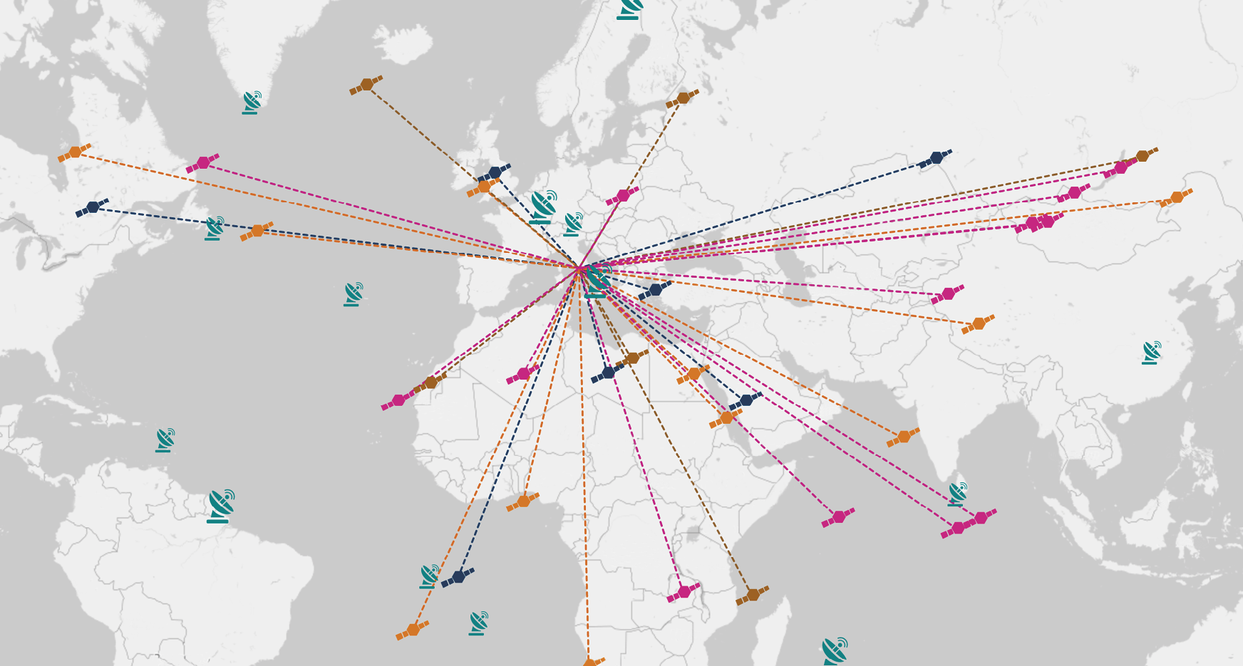 Je gleichmäßiger die Satelliten verteilt sind, desto besser ist die Positionsbestimmung an der ausgewählten Station. Die Farben stehen für die vier GNSS-Systeme: Blau für Galileo, Orange für GPS, Braun für GLONASS und Pink für BeiDou.