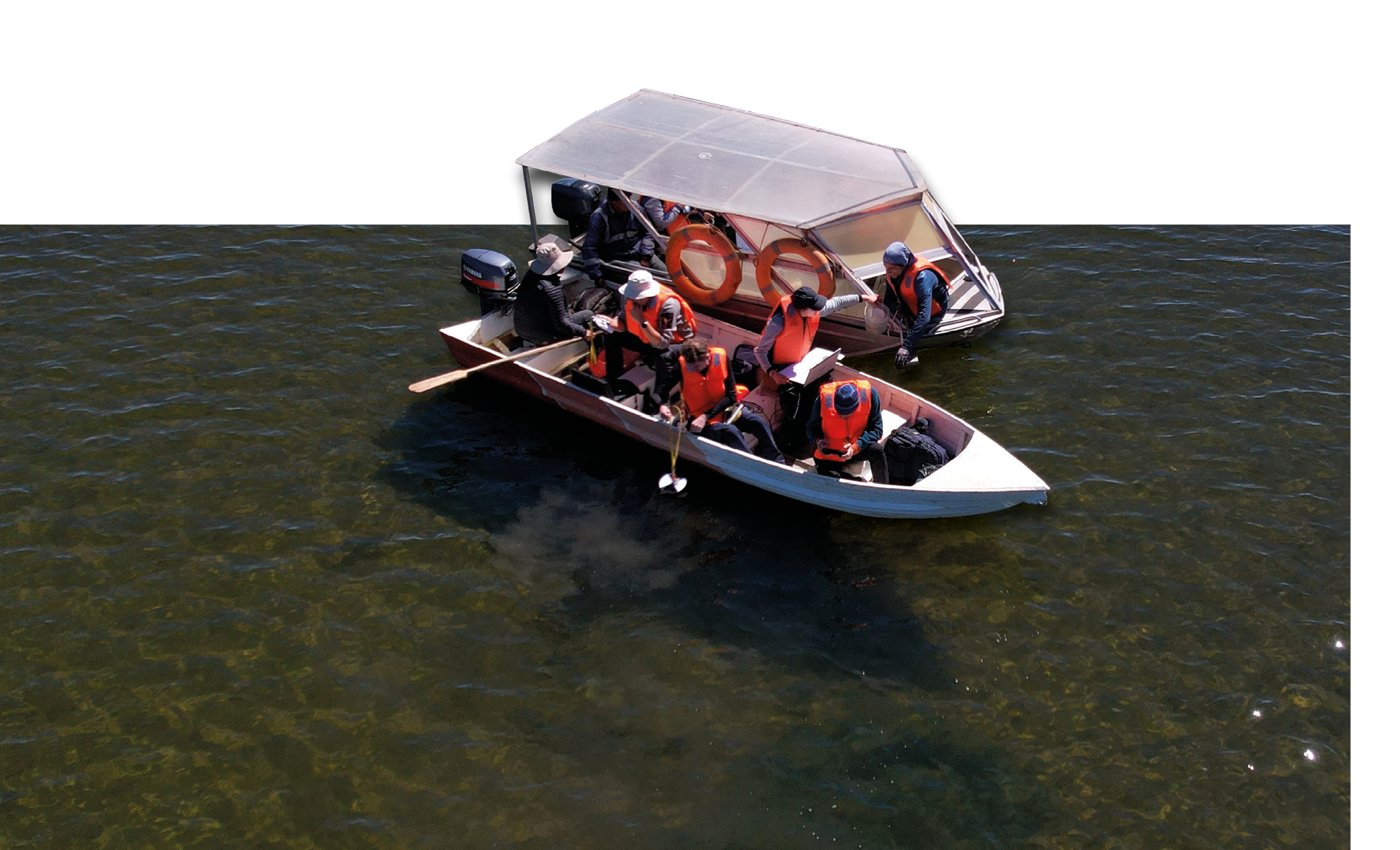 Das Team misst die Wassertiefe und sammelt Sedimentproben aus dem Boot heraus.