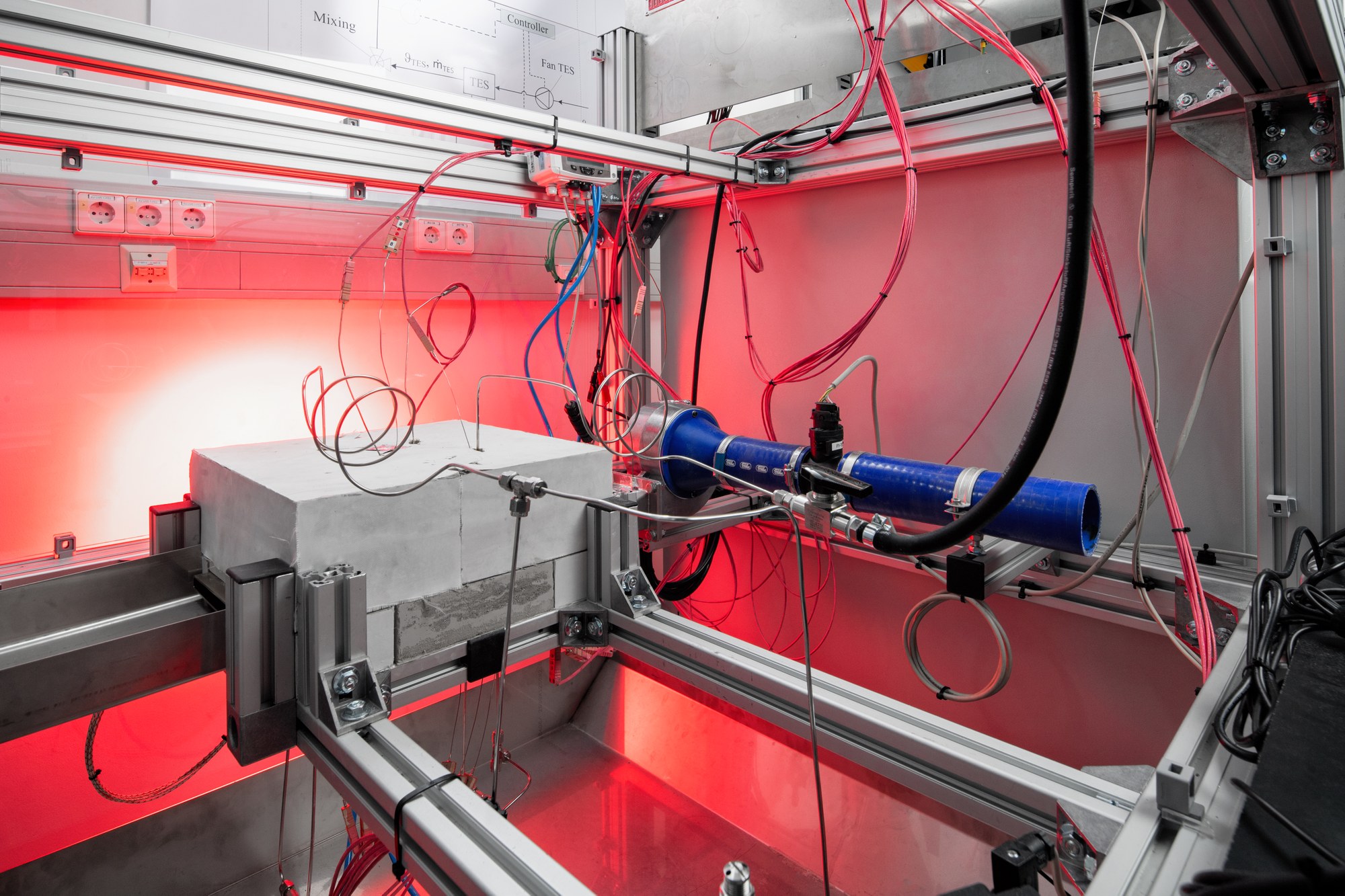 Der Prototyp des Latentwärmespeichers ist mit mikroporösem Dämmmaterial (grauer Kasten) ummantelt, um Wärmeverluste zu vermeiden. Auf dem Prüfstand messen zahlreiche Sensoren Temperatur, Druck und Volumen von Luftzufuhr (blaues Rohr) und Heizluftstrom.
