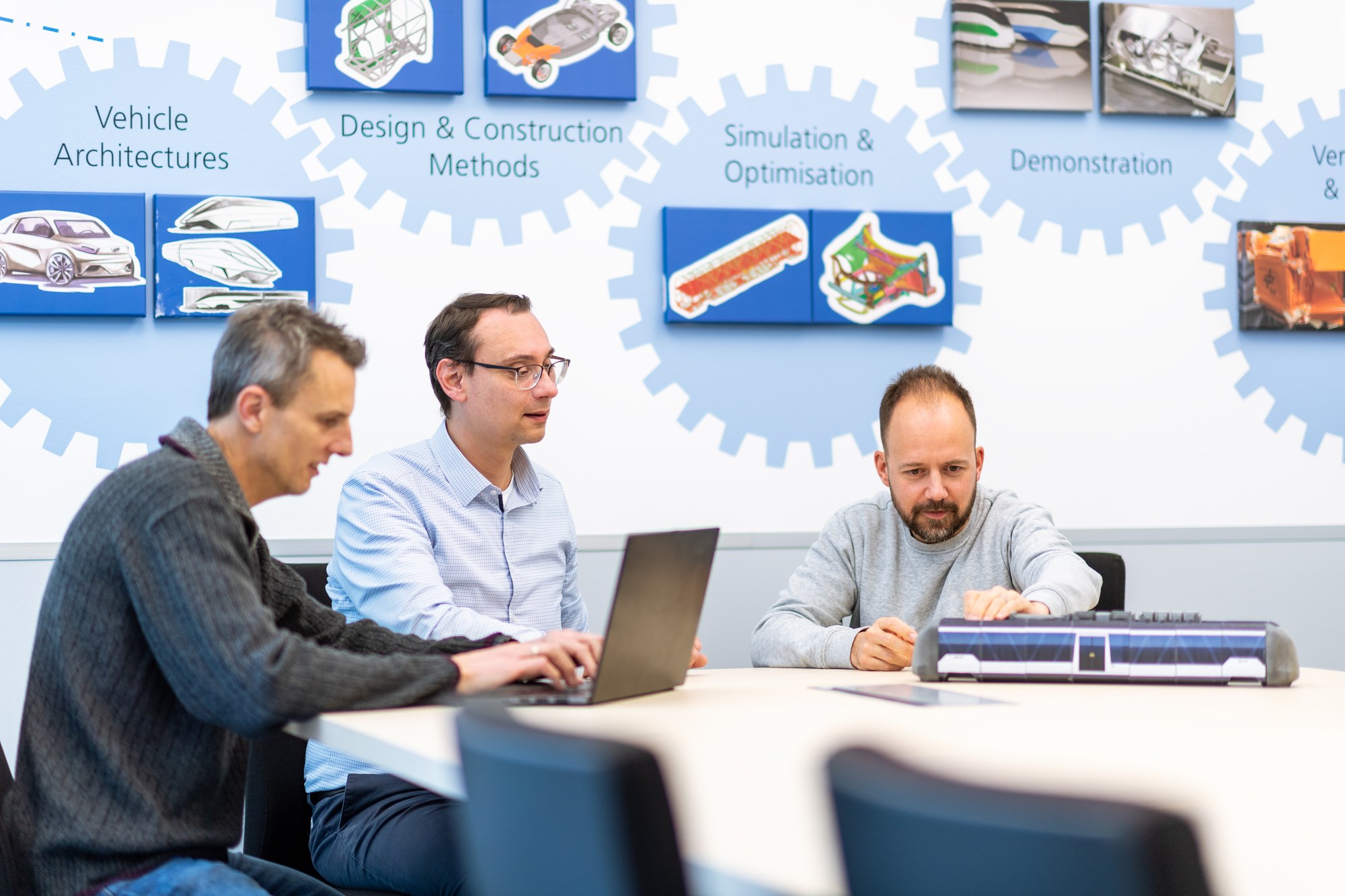 Von links: Dr. Gerhard Kopp, Dr. Jens König und Dr. Marco Münster beraten im Concept Lab des Instituts für Fahrzeugkonzepte über neue Ideen für das NGT-TAXI.