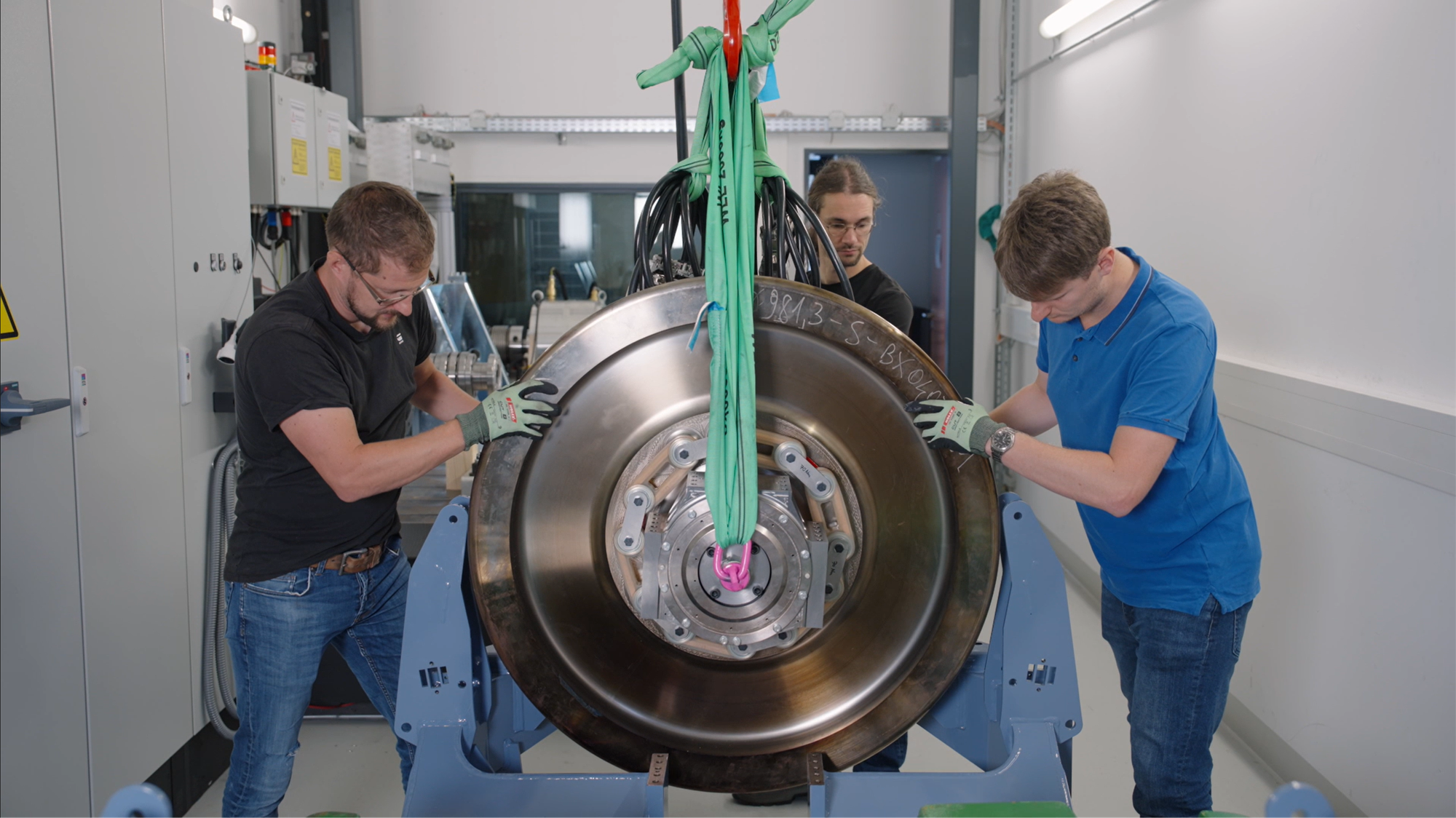 DLR-Forscher vom Institut für Fahrzeugkonzepte montieren ein Rad an ein Fahrwerk.