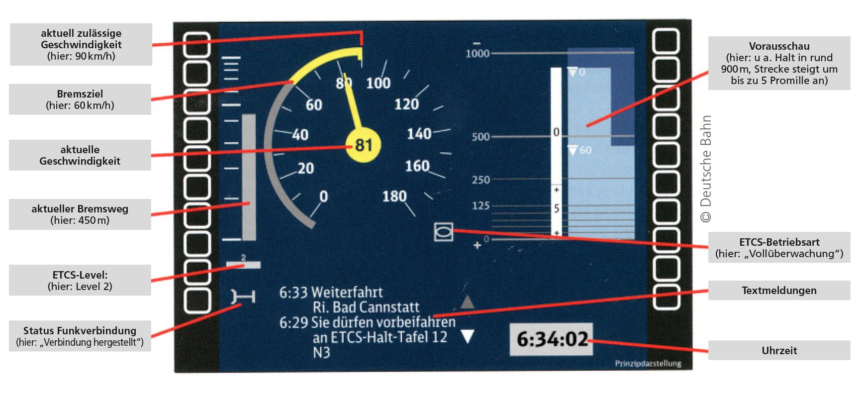 Ein Display zeigt Triebfahrzeugführenden beim Betrieb mit ETCS Level 2 alle wichtigen Informationen an. Konventionelle Signale auf der Strecke sind deshalb nicht mehr notwendig.