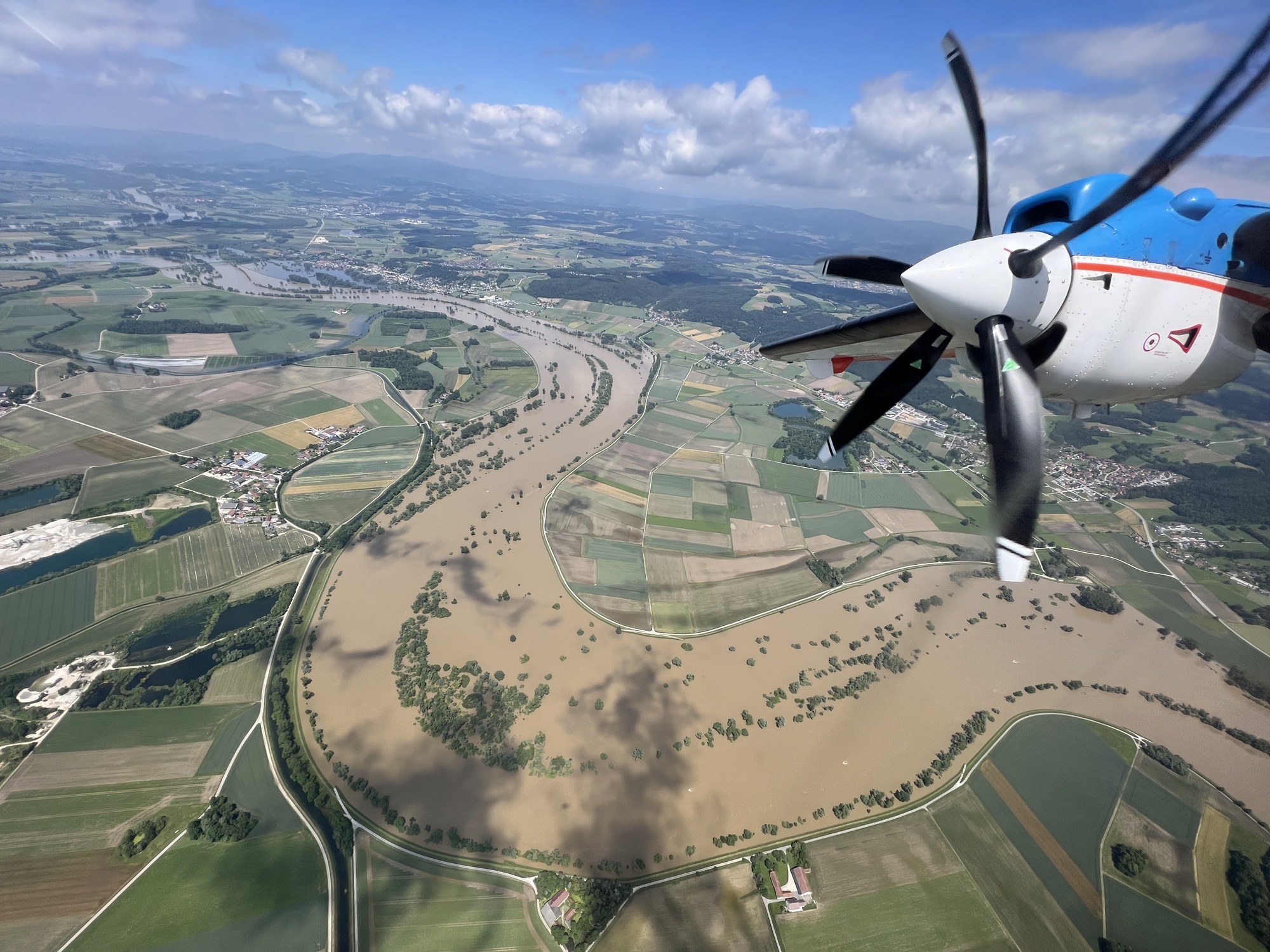 Das DLR-Forschungsflugzeug Dornier DO 228-212 war schon mehrfach bei Hochwassern im Einsatz, um hochauflösende Aufnahmen aus der Luft zu machen. Das Bild zeigt einen Ausschnitt des Donauhochwassers in Niederalteich im Frühsommer 2024.