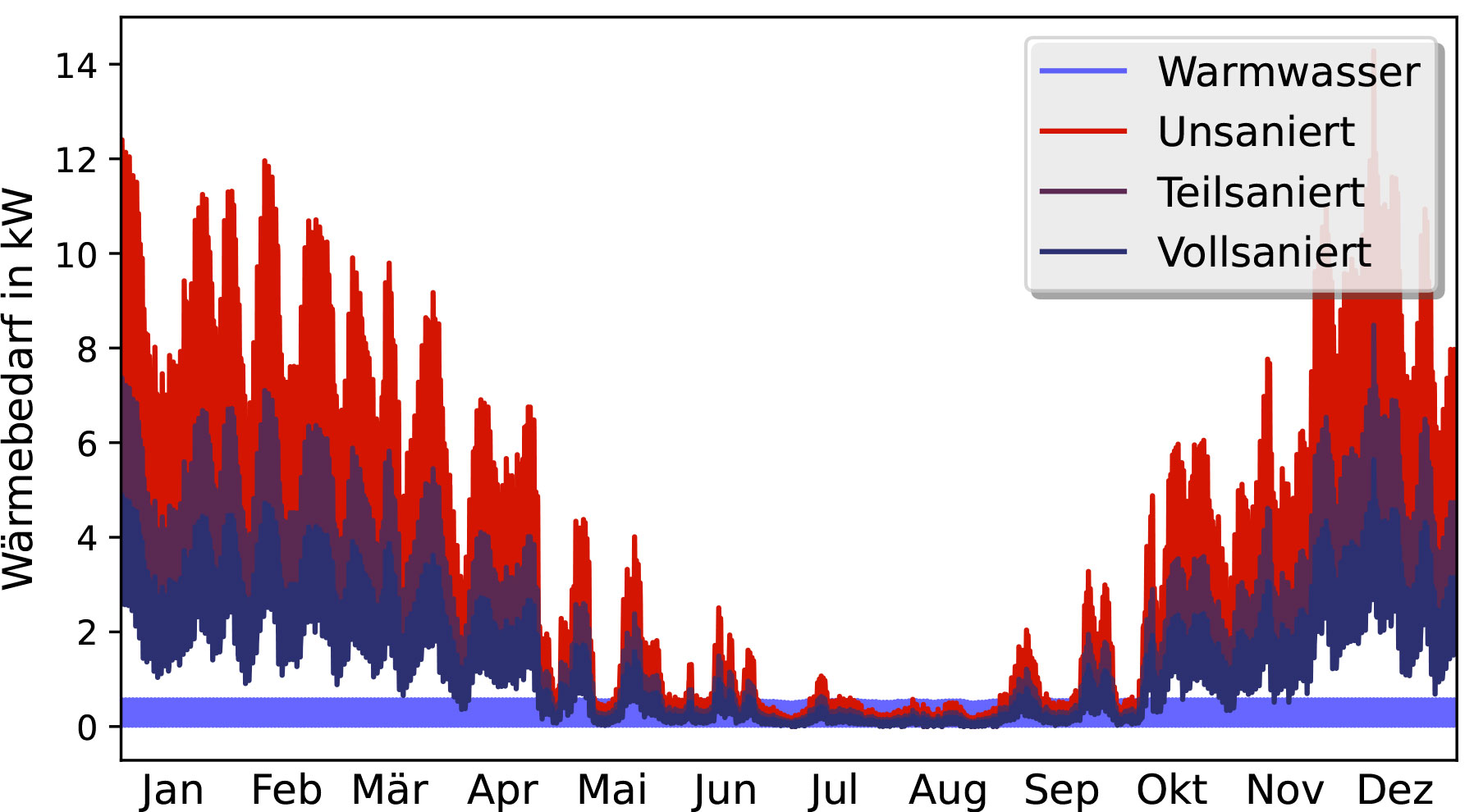 Wärmebedarf eines Gebäudes in drei Sanierungsständen: unsaniert, teilsaniert und vollsaniert