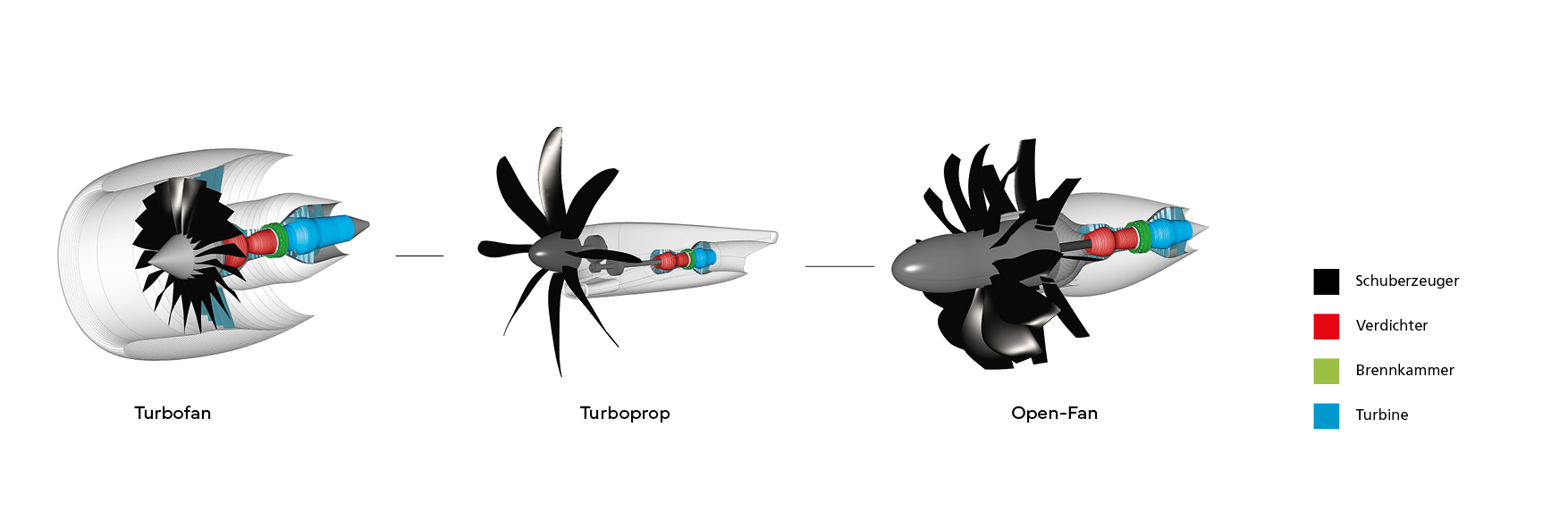 ummantelten Strahltriebwerken (Turbofans). Auf Kurzstrecken finden sich auch klassische Propeller (Turboprops). Gegenläufige, offene Antriebe (Open-Fans) sind noch nicht im Einsatz.