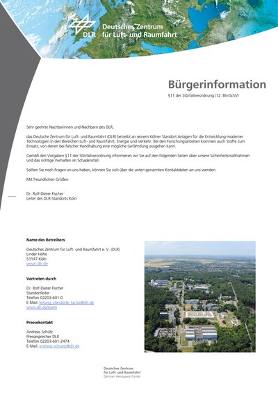 Das Deutsche Zentrum für Luft- und Raumfahrt (DLR) betreibt an seinem Kölner Standort Anlagen für die Entwicklung moderner Technologien in den Bereichen Luft- und Raumfahrt, Energie und Verkehr. Bei den Forschungsarbeiten kommen auch Stoffe zum Einsatz, von denen bei falscher Handhabung eine mögliche Gefährdung ausgehen kann. Gemäß den Vorgaben §11 der Störfallverordnung informieren wir Sie auf den folgenden Seiten über unsere Sicherheitsmaßnahmen und das richtige Verhalten im Schadensfall