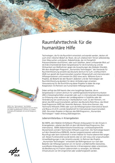 DLR-Flyer: Raum­fahrt­tech­nik für hu­ma­ni­täre Hil­fe