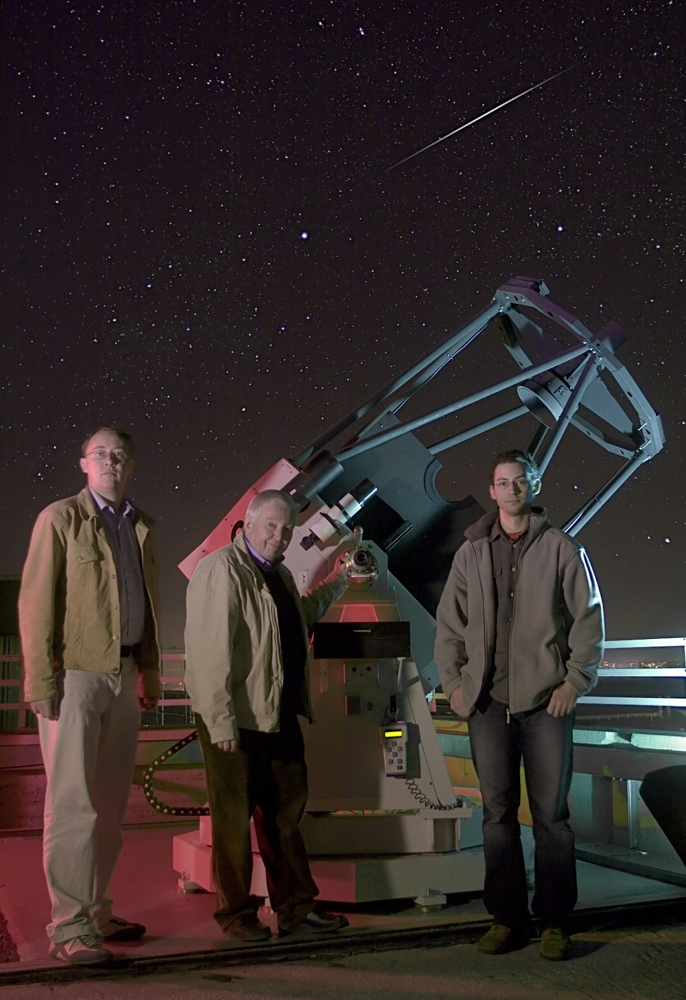 Das funktioniert so: Zuerst holt sich der Steuercomputer aus dem Internet die neuesten Bahndaten der ISS und rechnet aus, wo am Horizont die ISS beim nächsten Umlauf auftauchen wird. Er fährt das Teleskop zu dieser Position und lässt es dort in Wartestellung lauern. Huckepack auf dem großen Hauptfernrohr sitzt ein kleines Nachführ-Teleskop mit einer Videokamera.