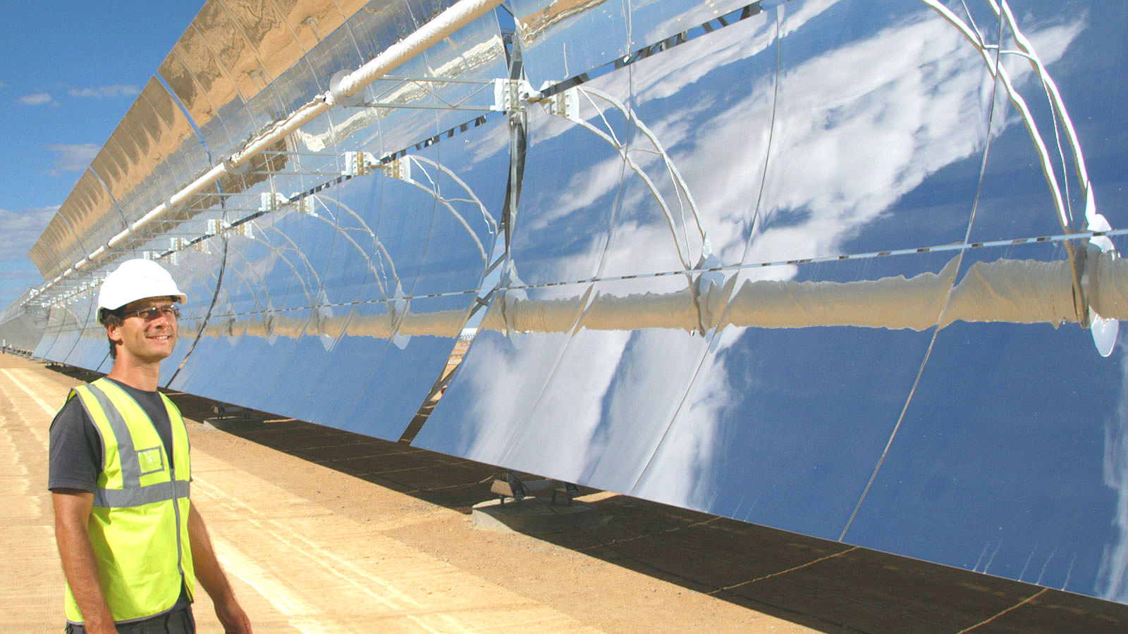 Ein Parabolrinnen-Kraftwerk setzt Spiegel ein, die länglich geformt und gebogen sind: fast wie überdimensionale Dachrinnen. Hier wird das Licht in der Mitte der Rinne gebündelt, wo ein Rohr mit einem speziellen Öl verläuft. Das Öl erhitzt sich und führt die Wärme ins Innere des Kraftwerks, wo Wasser in Dampf verwandelt wird und so schließlich die Turbinen und Generatoren angetrieben werden.