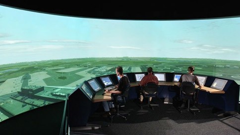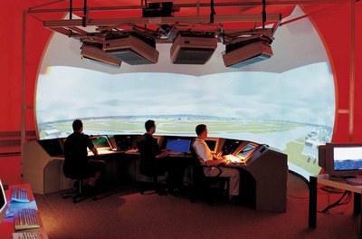 Hier sitzen echte Fluglotsinnen und -lotsen an einer originalgetreuen und voll funktionsfähigen Anlage – genau so, wie sie es aus ihrer täglichen Arbeit kennen. Doch was sie sehen, ist nicht die Wirklichkeit, sondern die künstliche Darstellung eines Flughafens. An der großen Bildwand werden die Bewegungen aller Flugzeuge innerhalb eines Flughafens nachgestellt. Auf ihren Monitoren können die Lotsinnen und Lotsen die Bewegungen der Flugzeuge verfolgen und Anweisungen geben.