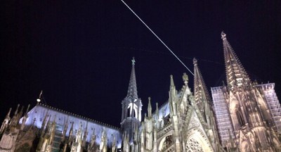 Auf diesem Foto flog die ISS gerade über Köln. Sie ist dabei nicht als heller Punkt, sondern als Strich abgebildet, weil die Kamera auf eine lange Belichtungszeit eingestellt wurde – und dann entsteht diese „Leuchtspur“, während die ISS über den Himmel zieht.