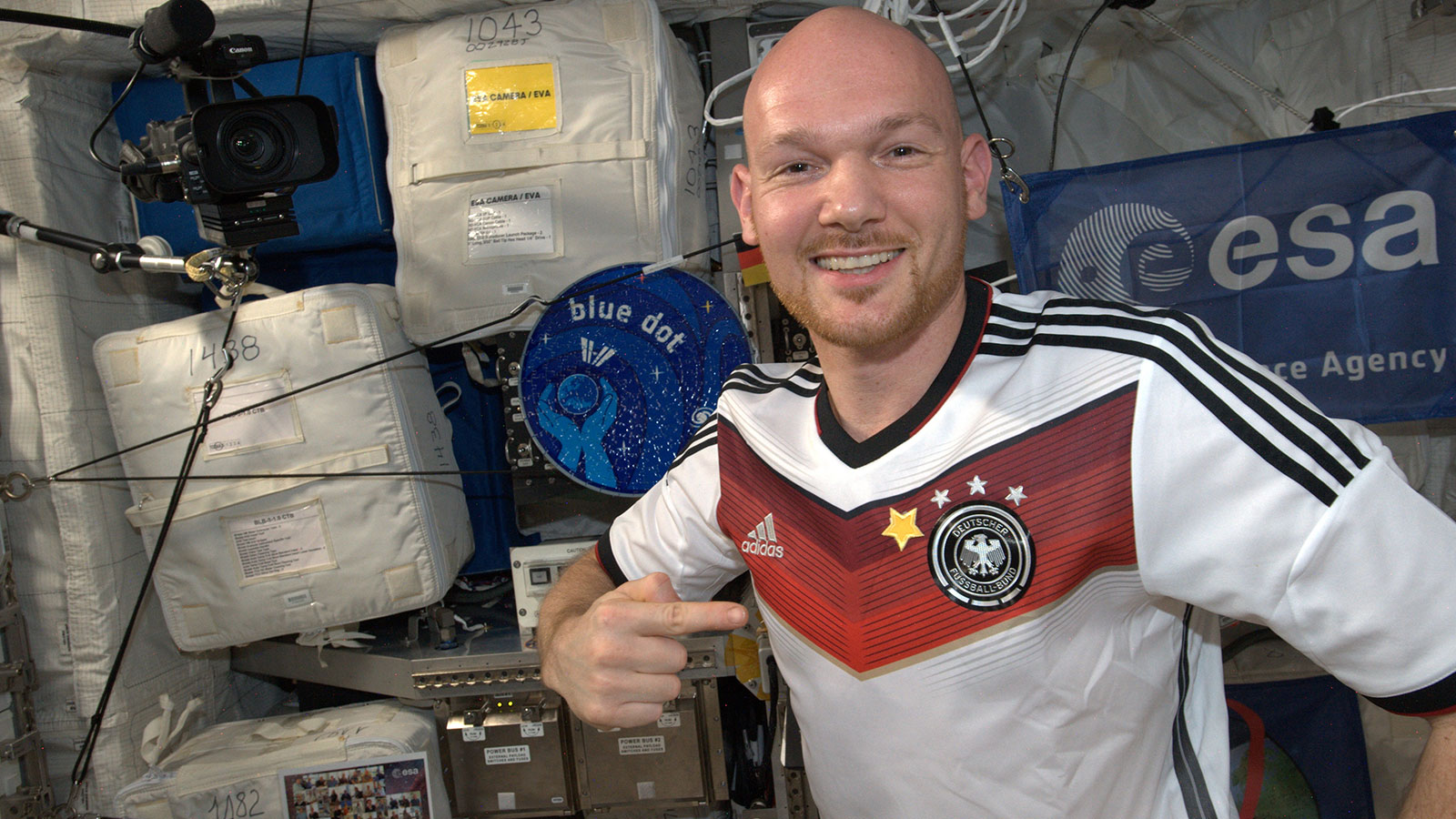 Als Alexander Gerst im Jahr 2014 als deutscher ESA-Astronaut auf der ISS war, wurde Deutschland gerade Fußball-Weltmeister – Grund für Alex, das Trikot anzuziehen, das er mitgenommen hatte …