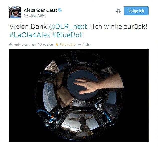 Nachtrag: Am 7. Juli bedankte sich Alex für die Grüße bei DLR_next und winkte allen zurück.