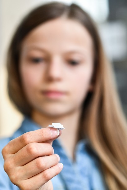 Dazu gehört ein winzig kleiner Papierflieger, den ein zehnjähriges Mädchen gefaltet hat. Er misst gerade mal einen Zentimeter Spannweite. Der Typ des Mini-Fliegers (Schwalbe oder manchmal auch Taube genannt) ist übrigens genau derselbe, den Alexander Gerst (natürlich in Originalgröße) auf seiner ersten ISS-Mission im Jahr 2014 mit an Bord hatte – hier ein interessantes Video dazu.