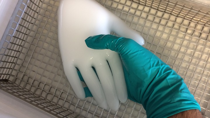 Die Metallzylinder als Behälter für die Mini-Objekte und die CD sind nur das eine! Damit sie nicht gegeneinander knallen und sich gegenseitig beschädigen, muss dazwischen Schaumstoff als Polsterung dienen. Doch normaler Schaumstoff könnte sich in 50 Jahren zersetzen. Daher suchen wir und suchen und suchen … Und dann werden wir im DLR-Standort Köln, direkt vor der Haustür, fündig: Das Institut für Werkstoff-Forschung stellt ein sogenanntes Aerogel zur Verfügung. Das ist eine Substanz, die sich wie Marshmallows anfühlt: schön weich und vor allem jahrzehntelang haltbar! Um die Formbeständigkeit zu testen, hat der Kollege einen Handschuh mit dem Aerogel gefüllt und es dann aushärten lassen. Als ich der Aerogel-Hand die Hand schüttele, ist sie immer noch etwas glibberig … Aber der Test hat funktioniert und auch Tests in Klimakammern bestätigen: Das Zeug hält eine Menge aus – auch ein halbes Jahrhundert.
