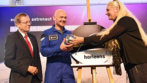 Die ESA gibt den Namen und das Logo der bevorstehenden Gerst-Mission bekannt: Horizons heißt sie – mit einem coolen Logo, das für die Erweiterung des Horizonts unseres Wissens, für neue Erkenntnisse steht. Außerdem überreicht die DLR-Vorstandsvorsitzende, Frau Prof. Ehrenfreund, an Alexander Gerst auf dieser Pressekonferenz die Zeitkapsel.