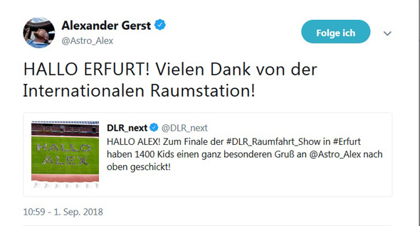 Am nächsten Tag antwortete Alexander Gerst per Twitter: „Hallo Erfurt! Vielen Dank von der Internationalen Raumstation!“