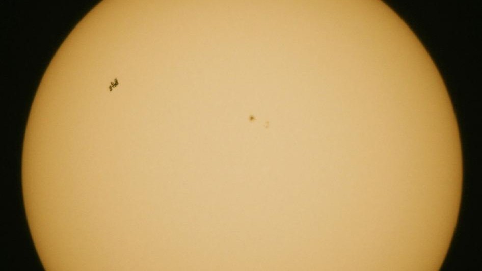 Eine ganz außergewöhnliche Aufnahme der ISS gelang DLR-Mitarbeiter Thilo Kranz. Er fotografierte die ISS gerade in dem Moment, als sie auf ihrer Bahn um die Erde – vom Boden aus gesehen – über die Sonne „huschte“. Die ISS ist links oben zu sehen – in der Mitte sind kleine Sonnenflecken zu erkennen.