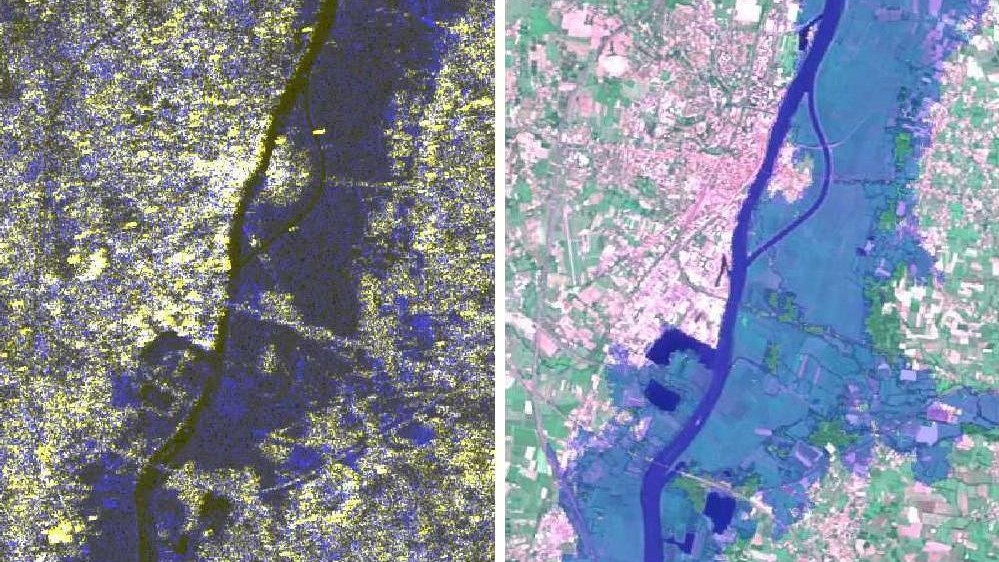 Man kann die Daten aus verschiedenen Zeiträumen auch in einem einzigen Bild kombinieren. Ein solches Bild wird „multitemporal“ genannt. Dadurch erkennt man dann etwa einen Fluss im Normalzustand und zugleich – in anderen Farben – die von Überschwemmungen betroffenen Gebiete. Solche „Vorher/Nachher-Bilder“ liefern daher wichtige Informationen, um der nächsten Überflutung vorzubeugen: etwa durch den Bau von Deichen und Dämmen. Oder indem man die Flut in ungefährliche Gebiete wie Wiesen und Felder umleitet.