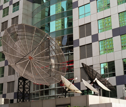 Erst Satelliten haben das Fernseh-Zeitalter in der heutigen Form ermöglicht, wie es für uns so selbstverständlich ist. In viel besserer technischer Qualität als früher – und bei wichtigen Ereignissen eben sogar live. Und das funktioniert so: Die Kameras und Mikrofone eines Fernsenders nehmen irgendwo auf der Welt ein Fußballspiel, ein Interview mit einem Politiker oder ein Musikkonzert auf. Oder ein Reporter berichtet von einem Unfall oder einer Naturkatastrophe. Aus dem Ü-Wagen – gewissermaßen einem fahrenden Fernsehstudio – sendet das TV-Team Bild und Ton mithilfe von Sendeantennen zum Satelliten, den man meistens nur für die Zeit der Sendung angemietet hat. Das ist der sogenannte „Up-Link“ – „up“, also „hinauf“ zum Satelliten. Der Satellit überträgt das Signal an die Fernseh-Teams – das ist dann der „Down-Link“. Und der Sender strahlt das Programm schließlich – wiederum über einen Satelliten – aus. Entweder wird es dann ins Kabelfernsehen eingespeist oder von einer der vielen „Schüsseln“ empfangen, die man häufig auf Balkonen und Dächern sieht.