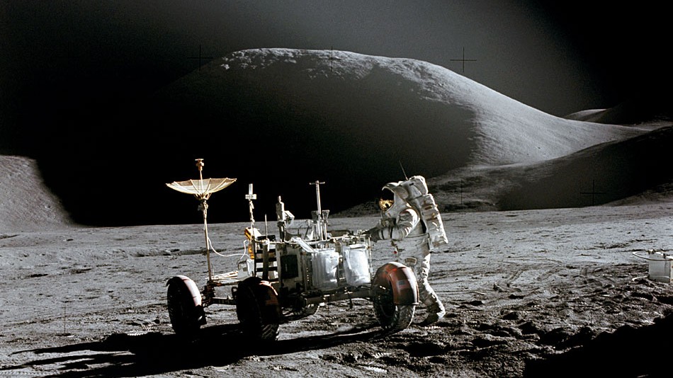 Hier steht der Astronaut James Irvin bei einem Stopp neben dem Mond-Auto. Im Hintergrund der mächtige Mons Hadley.
