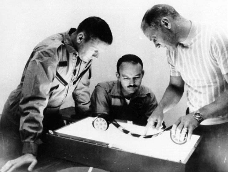 Die Crew beim Sichten der Filme mit den Bildern der Mission