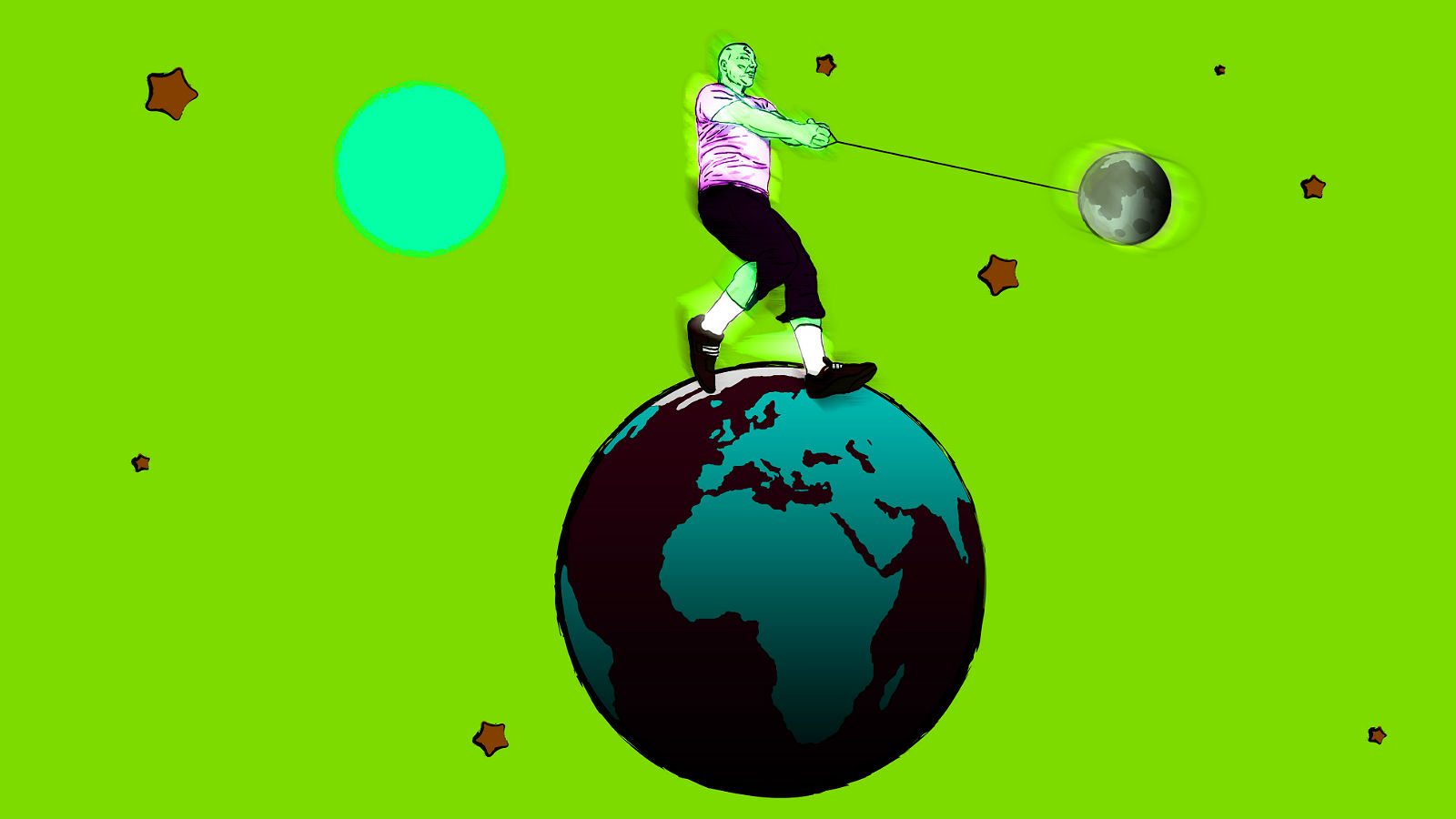 Wenn wir den Mond betrachten, sehen wir immer nur seine „Vorderseite“. Das ist etwa so wie bei einem Hammerwerfer und der Kugel, die er vor dem Wurf an einem Stahlseil um sich herumschleudert. Das Stahlseil ist im Falle des Mondes die Erdanziehungskraft, die den Mond auf seiner Bahn um die Erde hält. Und die Erdanziehung hat auch dafür gesorgt, dass sich der Mond immer langsamer um seine eigene Achse dreht. Anfangs rotierte er noch schneller als heute. Hätte es damals vor mehreren Milliarden Jahren schon Menschen auf der Erde gegeben – sie hätten mal die eine Seite des Mondes und mal die andere gesehen. Aber die Erdanziehung bremste die Rotation des Mondes immer weiter ab. Seitdem dreht sich der Mond genau einmal um sich selbst, während er einmal die Erde umkreist.