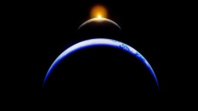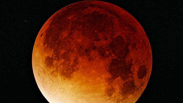 Es gibt noch eine andere Art von Finsternis – und zwar eine Mondfinsternis. Dann steht die Erde genau zwischen Sonne und Mond und wirft ihren Schatten auf die Mondoberfläche. Der Mond verdunkelt sich dabei – aber weil etwas Licht noch um unseren Planeten herum auf den Mond fällt, erscheint er in einem schummerigen Licht. Diese Lichtstrahlen, die den Mond dann noch erreichen, gehen vorher durch die Lufthülle der Erde, durch unsere Atmosphäre. Und weil die Atmosphäre nur die roten Anteile des Lichts durchlässt, erscheint der Mond dann rötlich. Zur Erklärung: Das mit den Lichtanteilen ist etwas kompliziert. Du weißt ja vielleicht von einem Regenbogen, dass das weiße Sonnenlicht eigentlich aus verschiedenen Farben besteht – die nur alle zusammen eben weiß aussehen. Unsere Lufthülle kannst du dir wie einen Filter vorstellen – und der lässt nur das rote Licht geradeaus durch, während die anderen Lichtfarben in andere Richtungen abgelenkt werden.