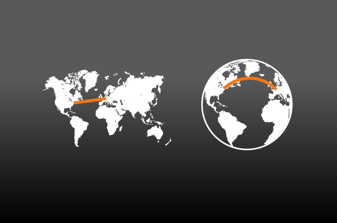 Hier ein weiterer Beweis, bei dem es um den kürzesten Weg zwischen zwei Orten wie beispielsweise Frankfurt und New York geht. Nimmt man eine flache Landkarte zur Hand und zeichnet eine schnurgerade Linie – das ist ja die kürzeste Distanz zwischen zwei Punkten – ein, so zeigt sich: Sie führt geradewegs über den mittleren Atlantik. Das Erstaunliche ist aber: In Wirklichkeit nehmen Flugzeuge zwischen beiden Orten eine ganz andere Route, nämlich weit über den nördlichen Atlantik hinweg (manchmal fast schon so weit im Norden, dass man die Spitze von Grönland sehen kann, wenn man einen Fensterplatz erwischt hat und nicht auf so einem doofen Mittelplatz mit den Sitznachbarn um die Armlehne kämpfen muss). Begründet wird das natürlich wieder mal damit, dass die Erde eine Kugel sei.
